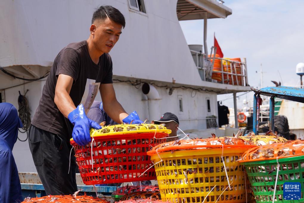 8月20日,船员在浙江省舟山市普陀区舟山国际水产城码头将一筐筐梭子蟹装车。新华社发(邹训永 摄)