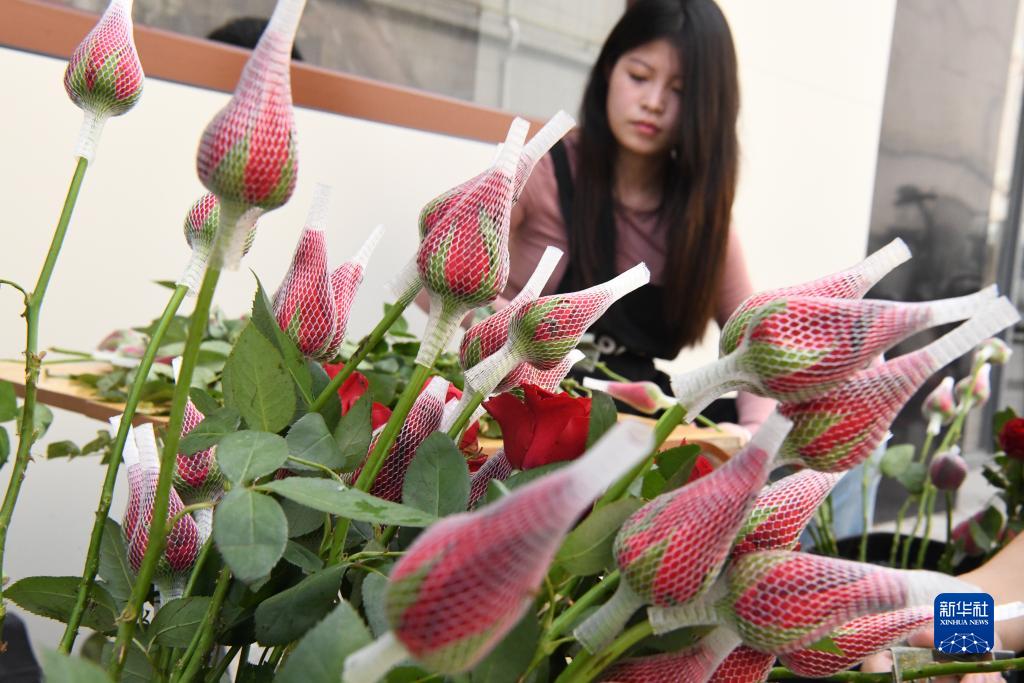 “七夕”将至,鲜花市场呈现俏销势头,不少商家精心准备花卉产品,吸引顾客前来购买。