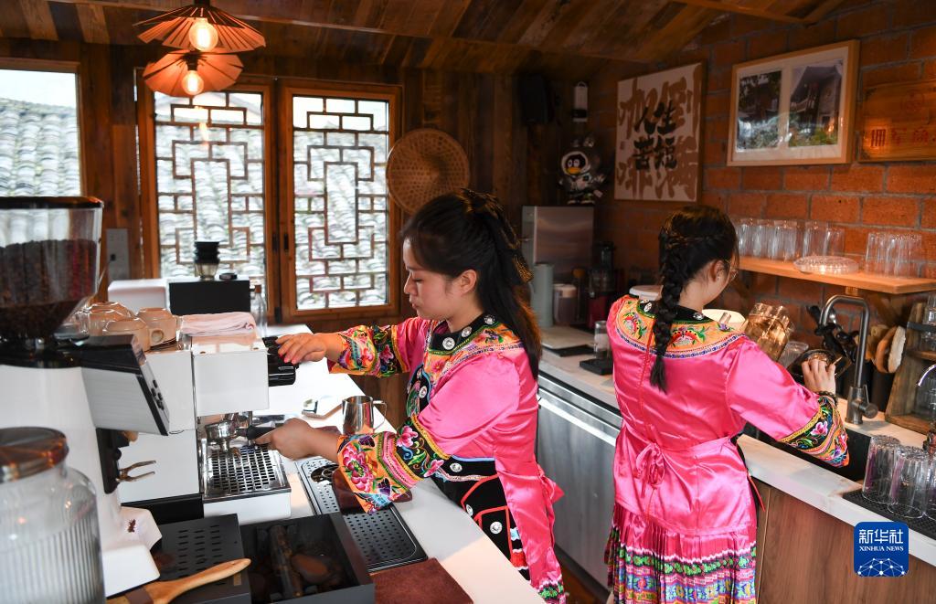 8月20日,酉阳县花田乡何家岩村一家咖啡厅的工作人员在准备饮品。