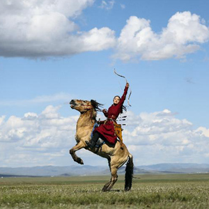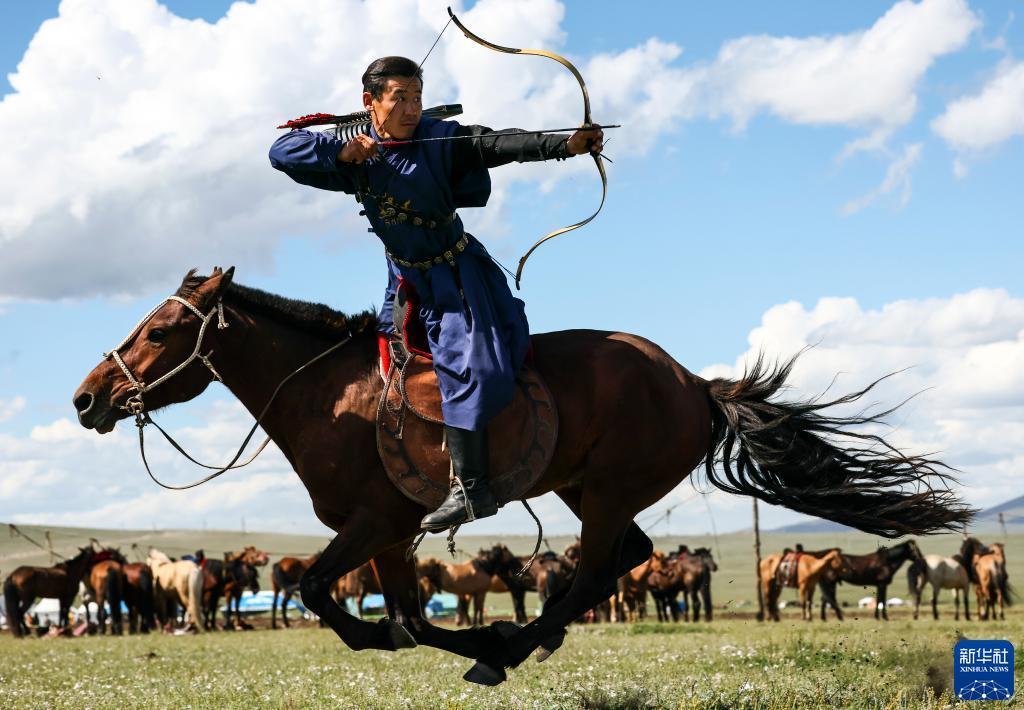 8月19日,在蒙古国泰吉山谷,选手在蒙古国“游牧民族”世界文化节上展示骑马射箭。