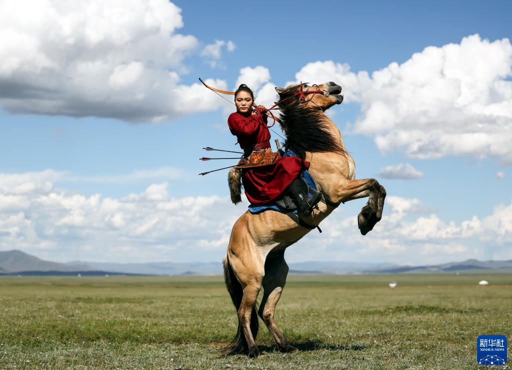 这是8月19日在蒙古国泰吉山谷举行的“游牧民族”世界文化节上拍摄的一名女选手。