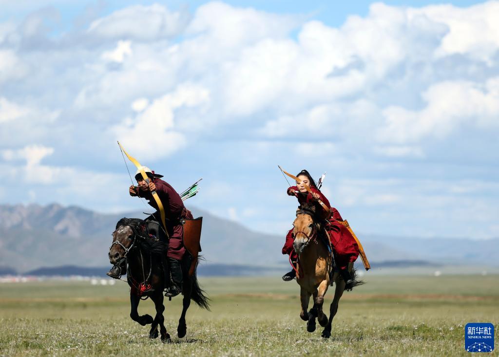 8月19日,在蒙古国泰吉山谷,选手在蒙古国“游牧民族”世界文化节上展示骑马射箭。