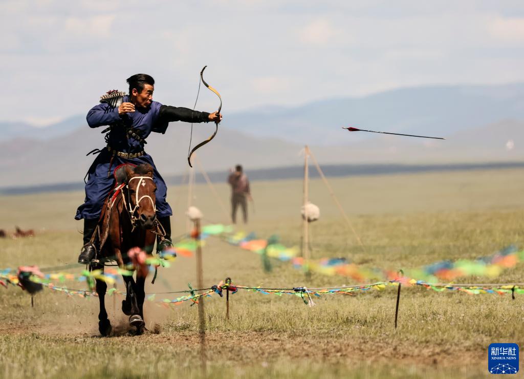 8月19日,在蒙古国泰吉山谷,选手在蒙古国“游牧民族”世界文化节上展示骑马射箭。