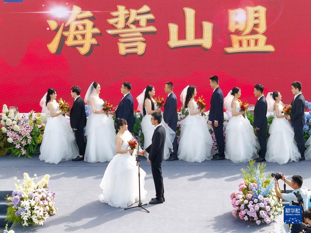 8月22日,新人们在山东青岛金沙滩啤酒城“爱情海湾”参加集体婚礼(无人机照片)。