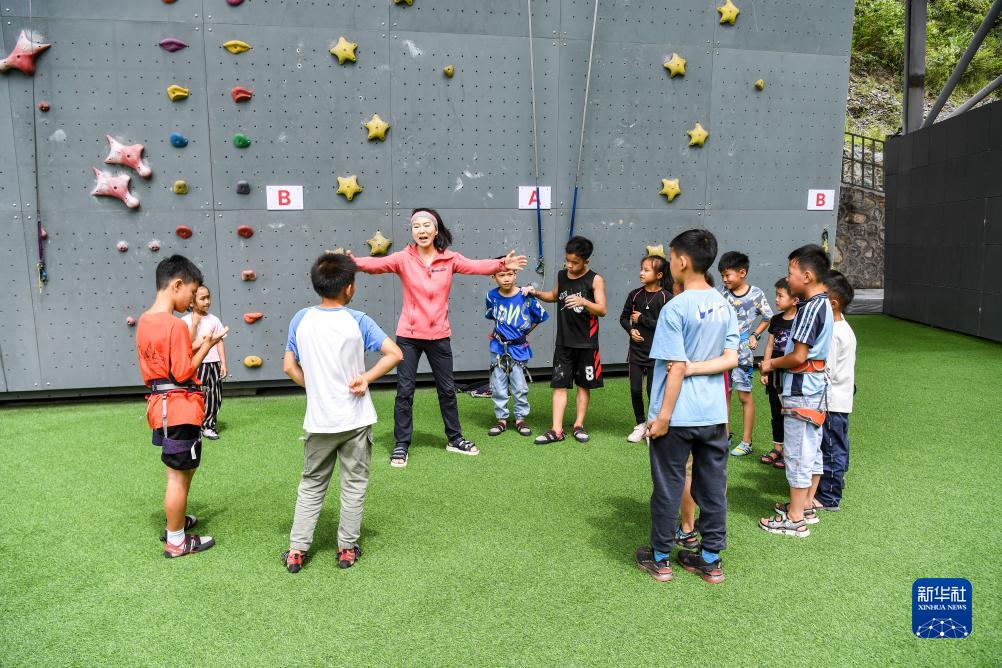 肖婷与前来学习攀岩的孩子互动交流(2021年6月26日摄)。