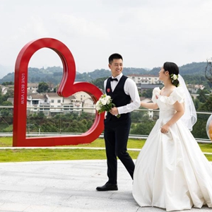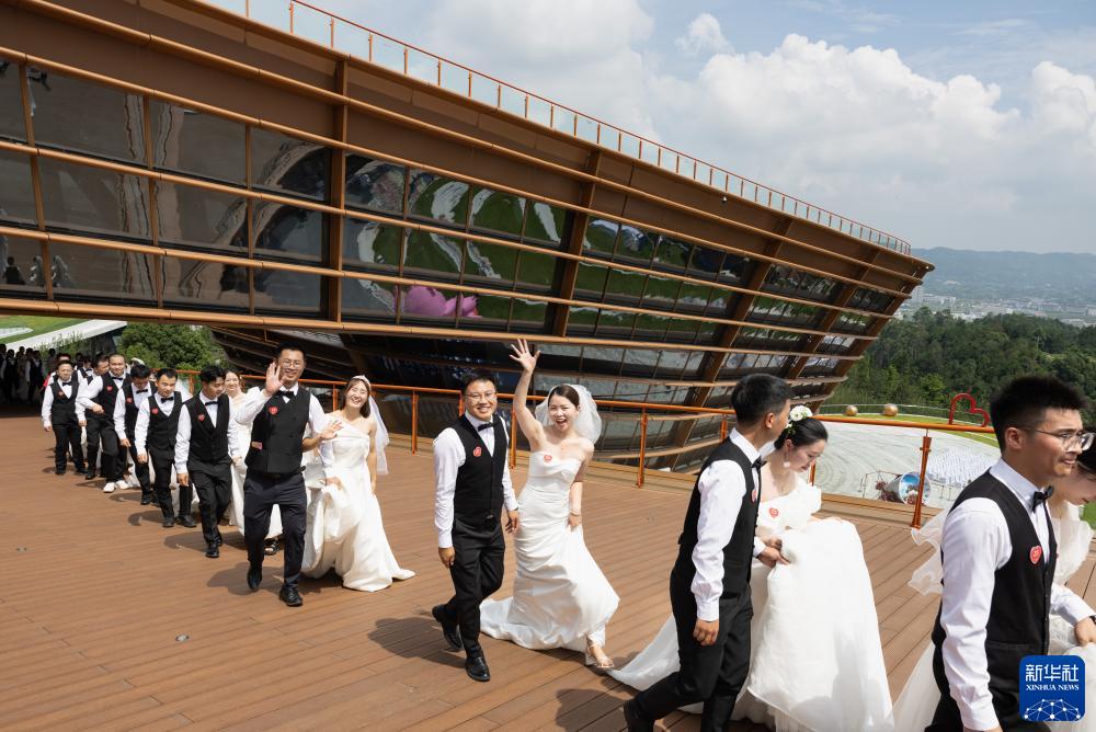 当日是七夕,来自四川省宜宾市三江新区33对新人在三江新区“三江之眼”举办了“为爱奔赴·幸福三江”主题集体婚礼。