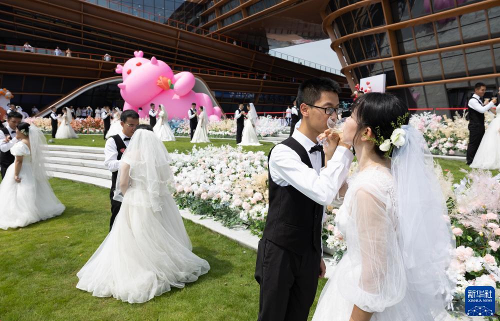 8月22日,新人在三江新区“三江之眼”举行集体婚礼时喝交杯酒。