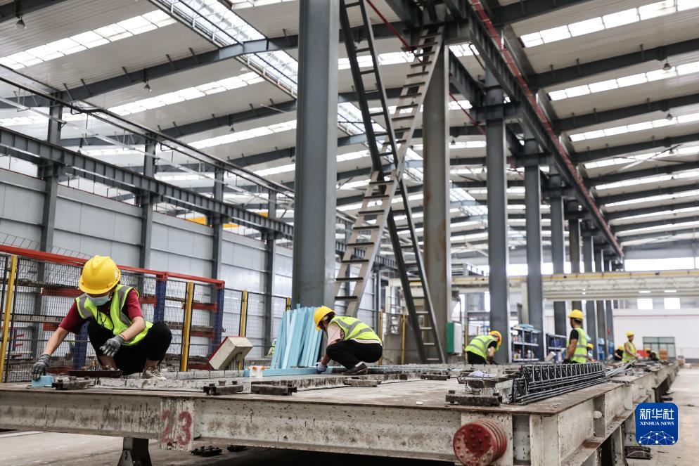 8月22日,海南定安县新竹镇华润智筑科技(定安)装配式示范产业基地工人在捆扎钢筋。