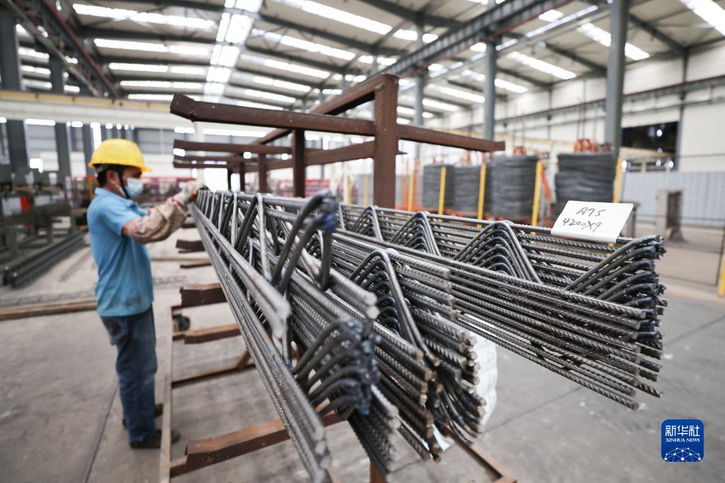 8月22日,海南定安县新竹镇华润智筑科技(定安)装配式示范产业基地工人在摆放钢筋。