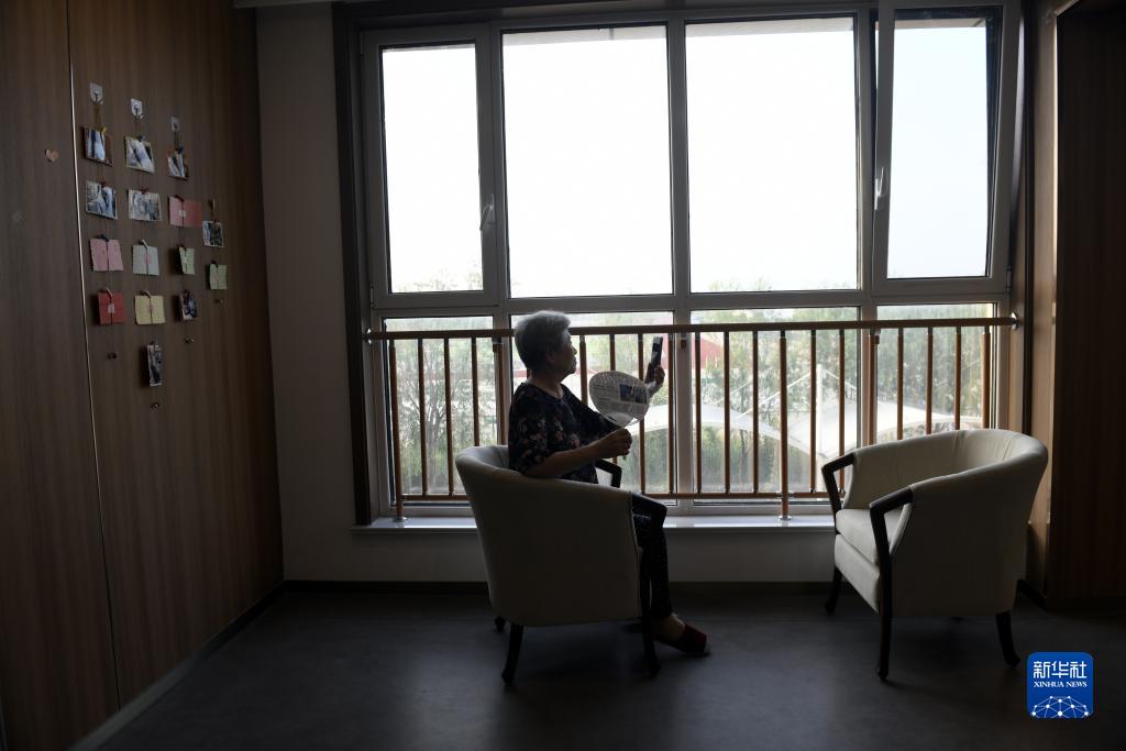 8月21日,老人在位于山东省滨州市沾化区大高镇国昌怡心园内的护理公寓中欣赏傍晚湖景。