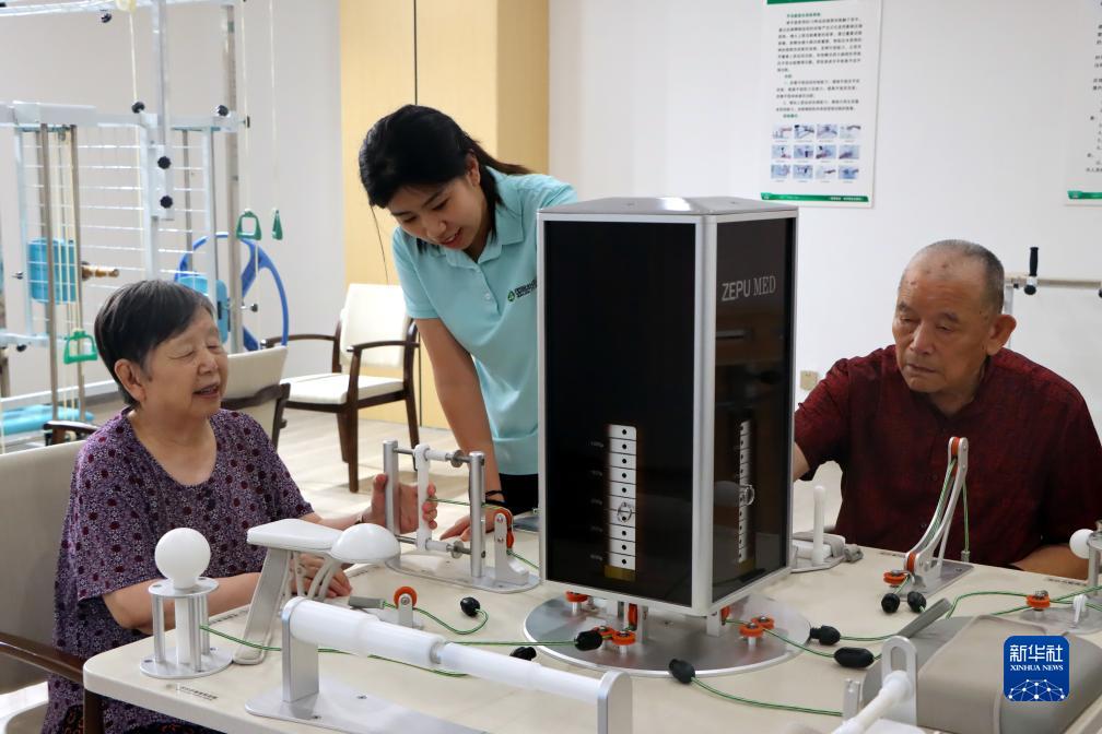 8月21日,老人在位于山东省滨州市沾化区大高镇国昌怡心园内的康复小屋做上肢康复训练。