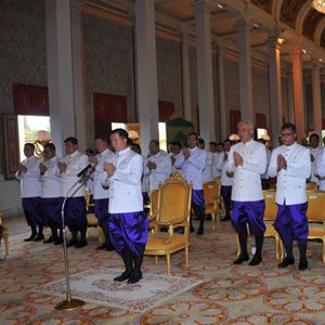 8月22日,柬埔寨首相洪玛奈(前中)在首都金边率领新内阁宣誓就职。