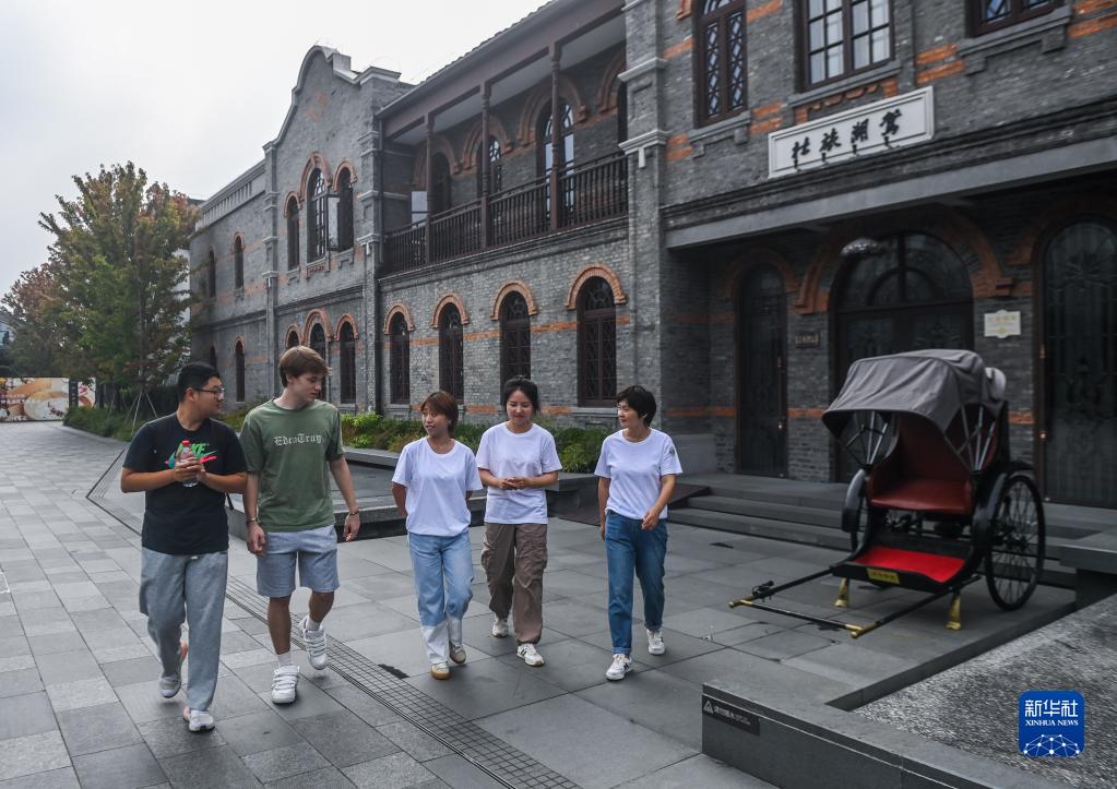 8月23日,在嘉兴南湖边,一名外教(左二)带着参加培训的导游们模拟外国游客游览过程中各种场景。