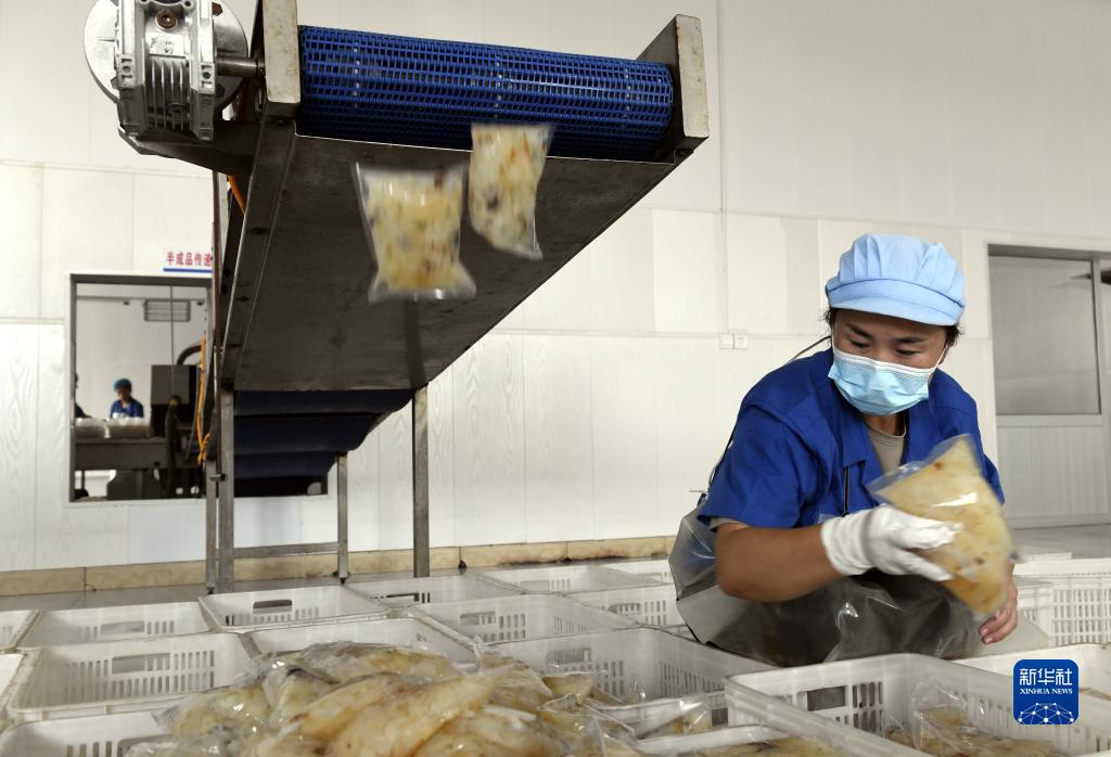 8月22日,在山东省滨州市沾化区冯家镇隆旺水产的加工车间内,工人在装箱即食海蜇。