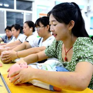 8月22日,老师(左二)在育婴员培训班上为学员们讲解抚触婴儿的手法。