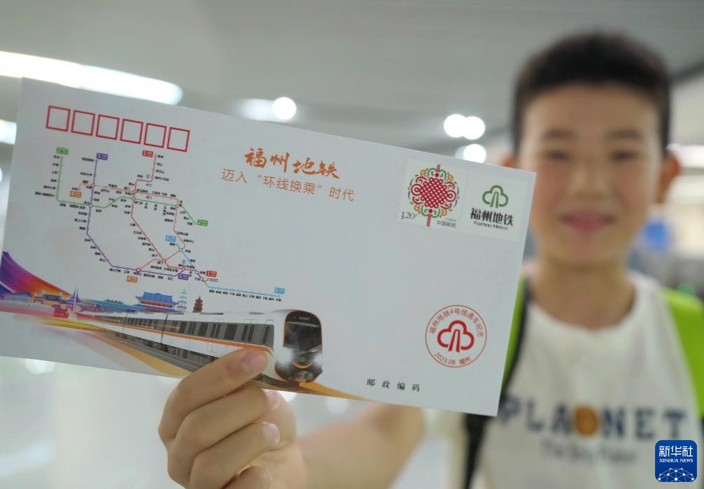 8月23日,一名小朋友在福州地铁东街口站内展示福州地铁4号线通车纪念首日封。