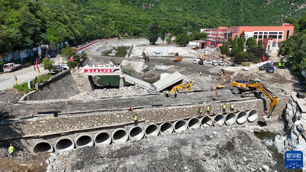 8月23日,在北京市房山区霞云岭中心小学,北京建工机施集团的施工人员在抢建供学校与外界通行的新桥梁(无人机照片)。