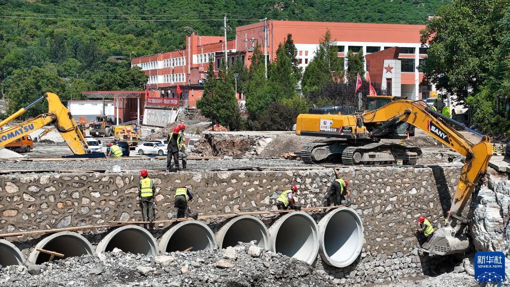 8月23日,在北京市房山区霞云岭中心小学,北京建工机施集团的施工人员在抢建供学校与外界通行的新桥梁(无人机照片)。