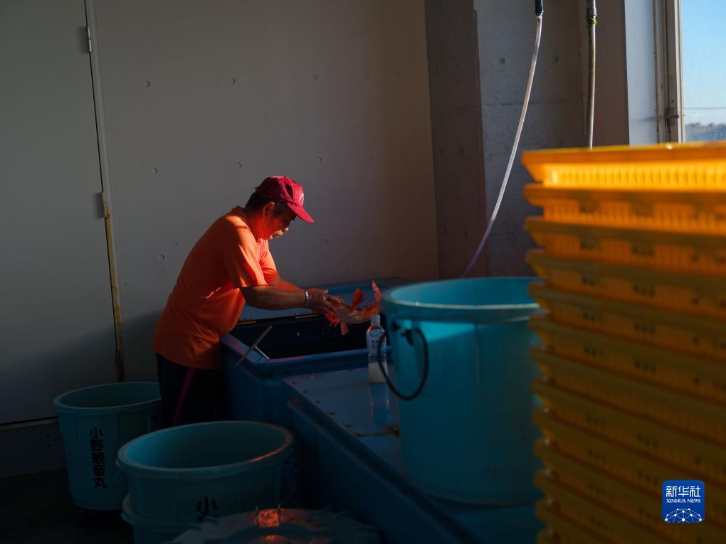8月23日,打渔归来的小野春雄在日本福岛县新地町的渔港处理捕获的鱼。新华社记者 张笑宇 摄