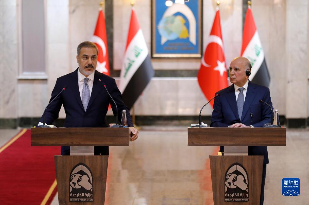 8月22日,伊拉克外长侯赛因(右)与到访的土耳其外长菲丹在巴格达举行联合记者会。