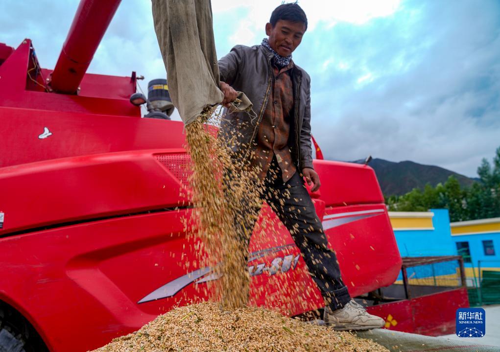目前,西藏各地进入秋收时节。西藏山南市乃东区的农民在抓紧收获作物。
