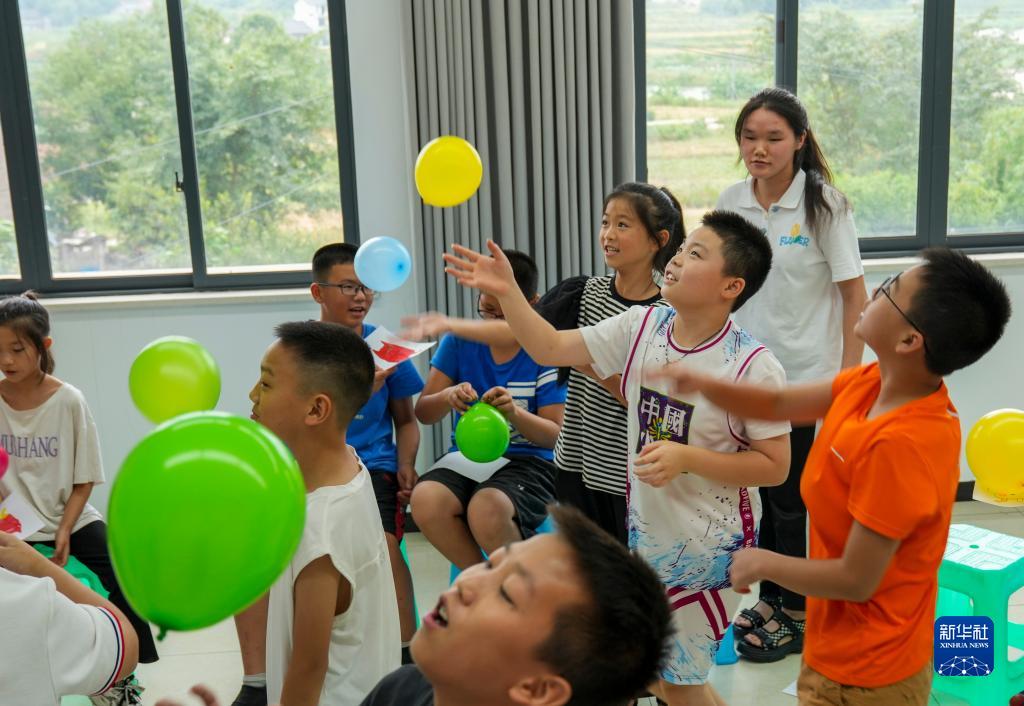 8月24日,在重庆市九龙坡区新民村村委会活动室内,孩子们在心理咨询师志愿者的指导下进行互动小游戏。新华社记者 刘潺 摄