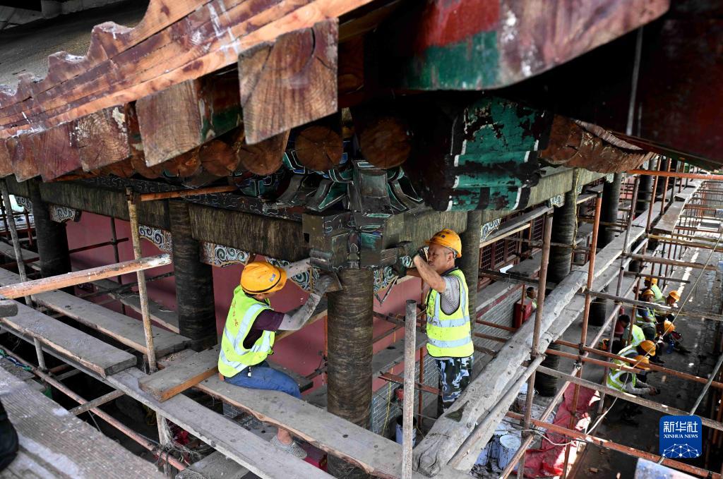 8月24日,施工人员在河北正定古城南城门楼施工现场进行修缮作业。