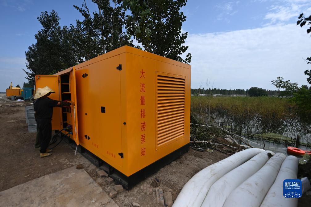 8月24日,工作人员在天津市静海区大清河南堤抽水现场检查抽水泵工作状态。