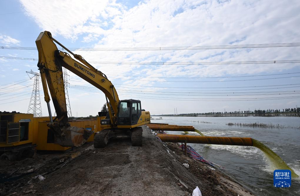 8月24日,一辆挖掘机在天津市静海区大清河南堤抽水现场作业。
