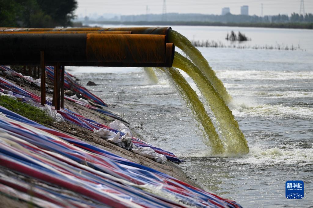 8月24日,大型抽水泵将天津市静海区王口镇茁头排干渠西侧农田内的积水抽排到大清河河道内。