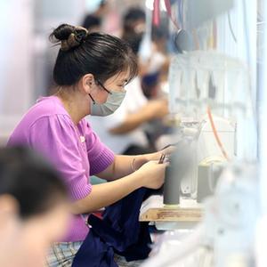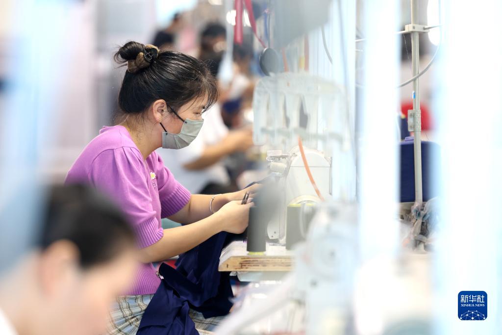 8月24日,在福建省福州市仓山区一家制衣企业,工人生产服装产品。