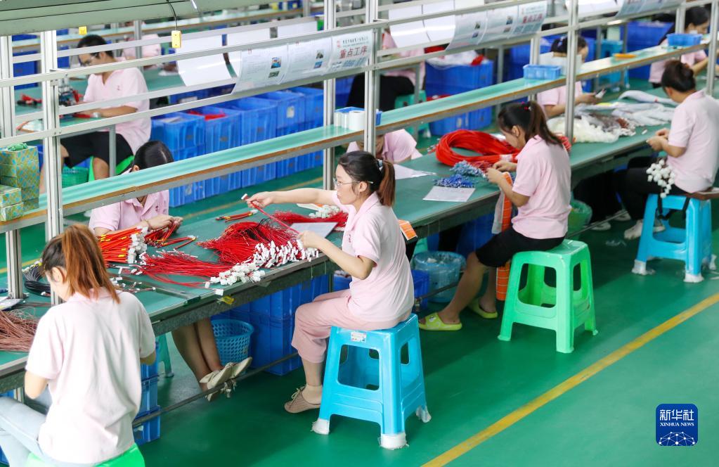8月24日,四川省广安华蓥山经开区一家电子企业的线束车间,员工在流水线上作业。