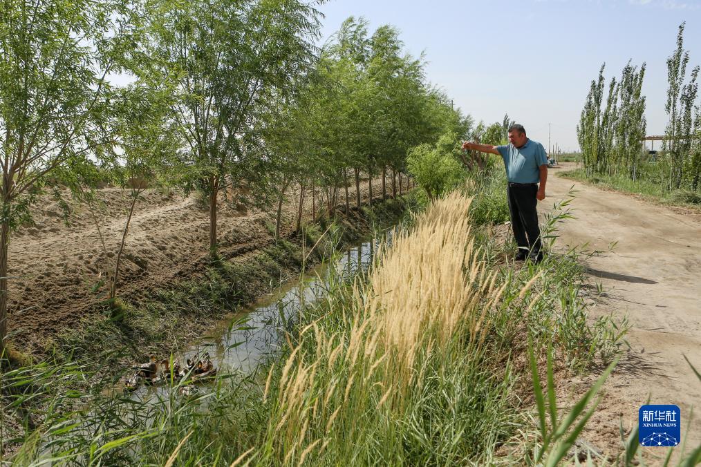 8月17日,尔肯·热衣木在棉田附近的水渠旁呼赶鸭子上岸,以清点鸭子的数量。