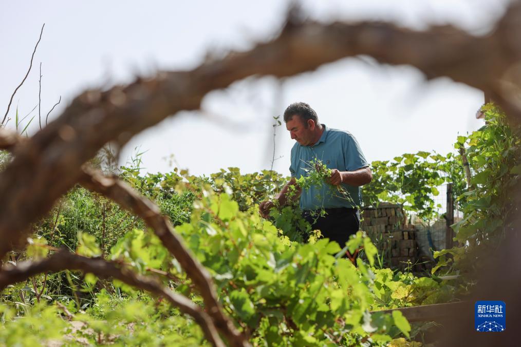8月18日,尔肯·热衣木在自家棉田的小院中清理葡萄架旁的杂草。这些葡萄架是今年新栽的,为把院子改造成农家乐做准备。
