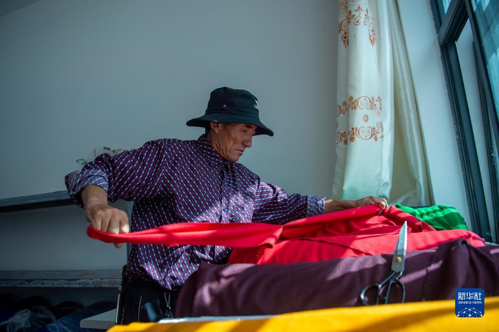 一位村民在裁剪布料(8月24日摄)。
