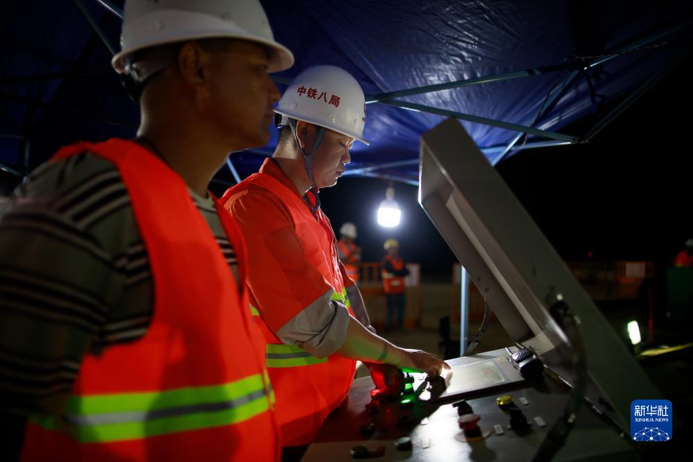 8月25日,工作人员在操作设备以控制尖坡寨特大桥转体角度。