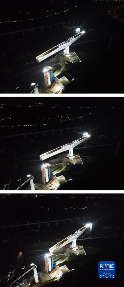 这张拼版照片展示的是尖坡寨特大桥转体过程(无人机照片,8月25日摄)。