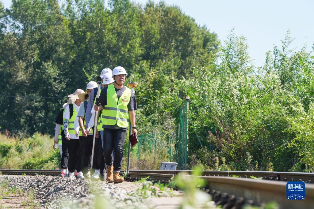在黑龙江省双鸭山市集贤县的铁路沿线,勘察班组成员在铁路既有线开展调查作业(8月24日摄)。