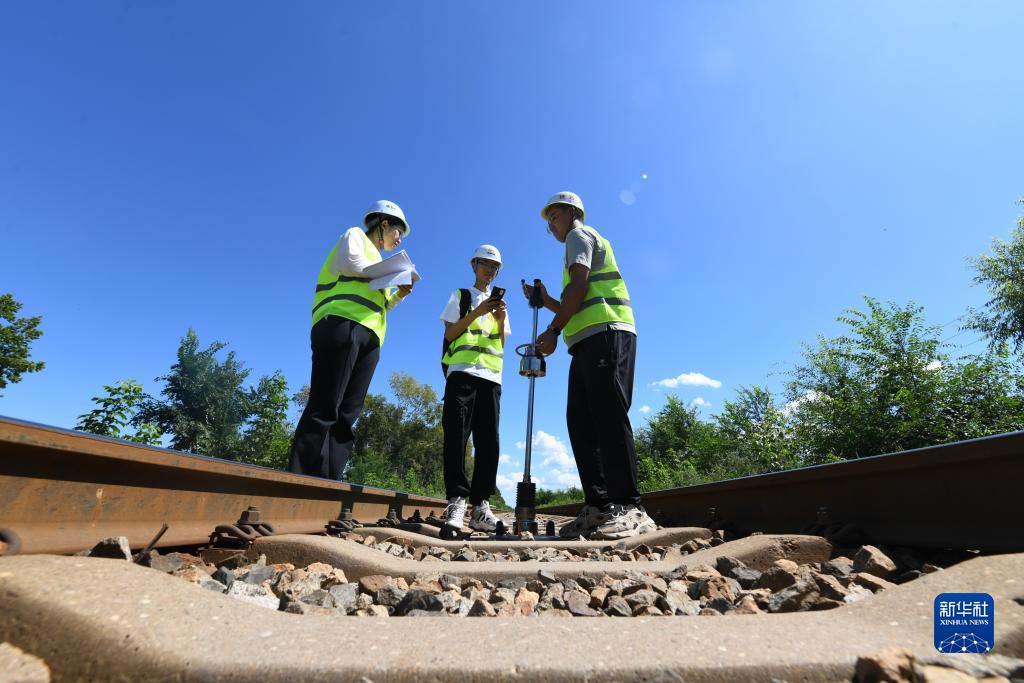 在黑龙江省双鸭山市集贤县的铁路沿线,部分勘察班组成员在铁路既有线开展路基状态检测作业(8月24日摄)。