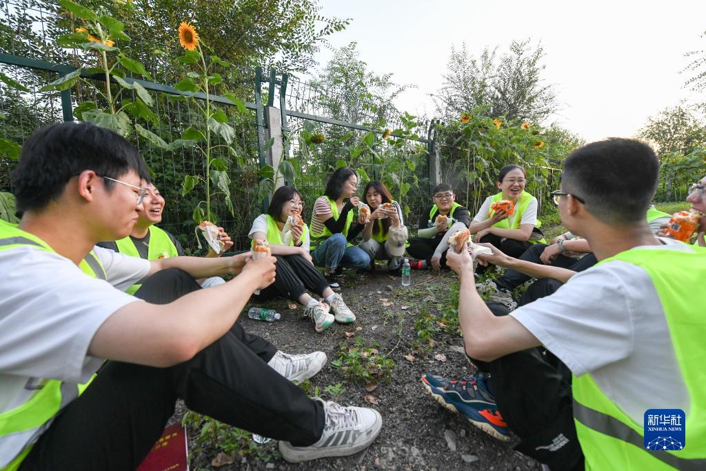 在黑龙江省双鸭山市集贤县的铁路沿线旁一空地,勘察班组成员在工闲时吃饭休息(8月24日摄)。