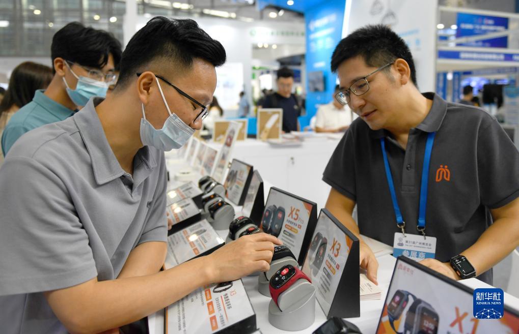 8月25日,市民在广州博览会上参观选购智能手表。
