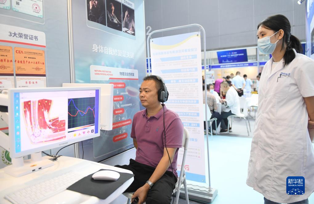 8月25日,市民在广州博览会上现场体验身体健康检查。