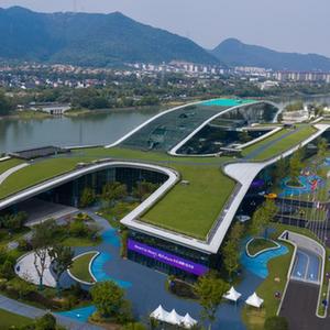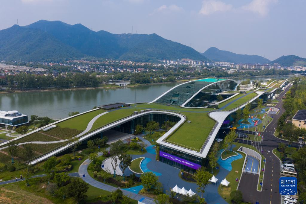 8月24日,空中俯瞰杭州富阳水上运动中心,屋顶被绿植覆盖(无人机照片)。