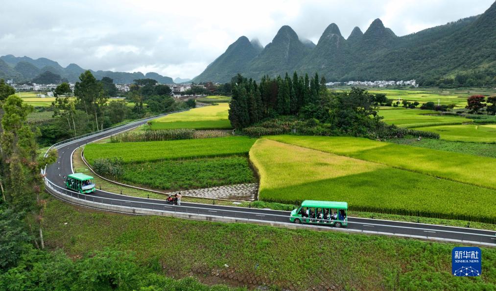 8月25日,游客乘坐观光车在贵州省黔西南布依族苗族自治州兴义市万峰林景区观光游览(无人机照片)。新华社发(袁福洪摄)