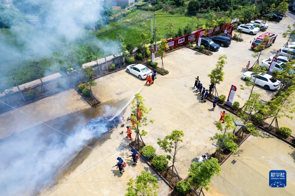 8月25日,在浏阳市金刚镇政府院内,护林员和森林消防队员进行消防演练(无人机照片)。