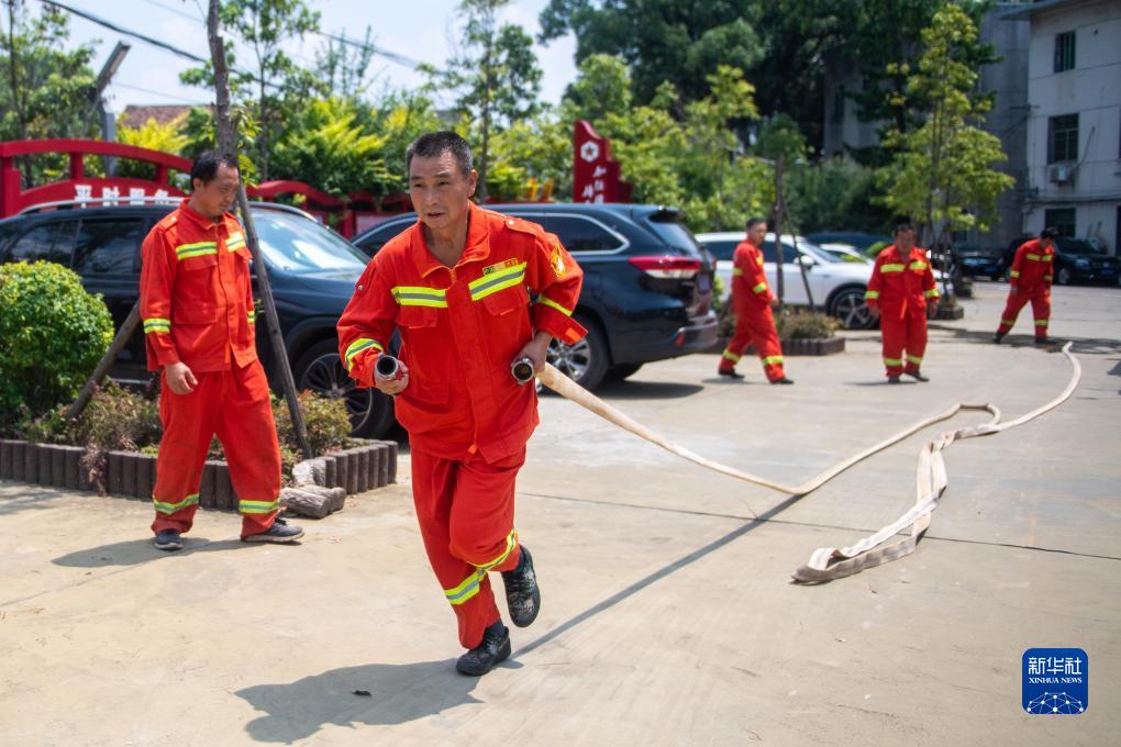 8月25日,在浏阳市金刚镇政府院内,黄蔚谷(左二)和同事们进行消防演练。