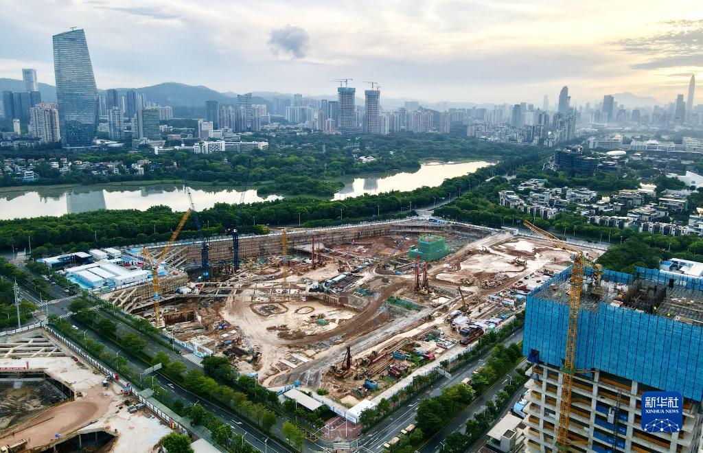 这是由中建五局承建的深圳湾滨海商务中心项目,现场150余名建设者在进行地下室基坑和视觉样板地上主体结构作业(8月26日摄)。