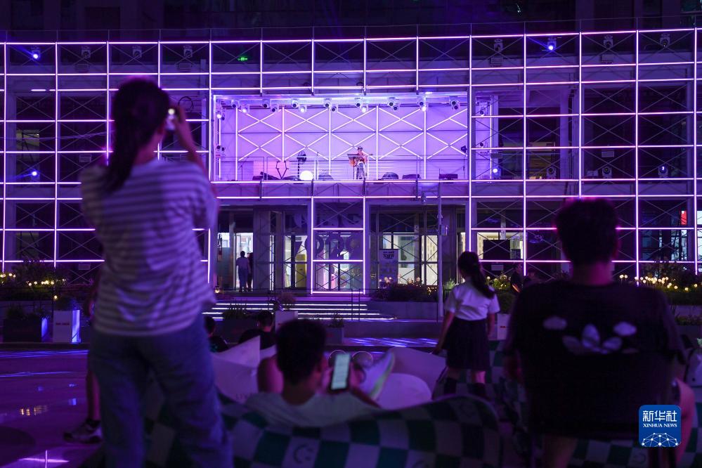 市民游客在南京市建邺区西城·夜未央街区内观看空中舞台表演(8月25日摄)。