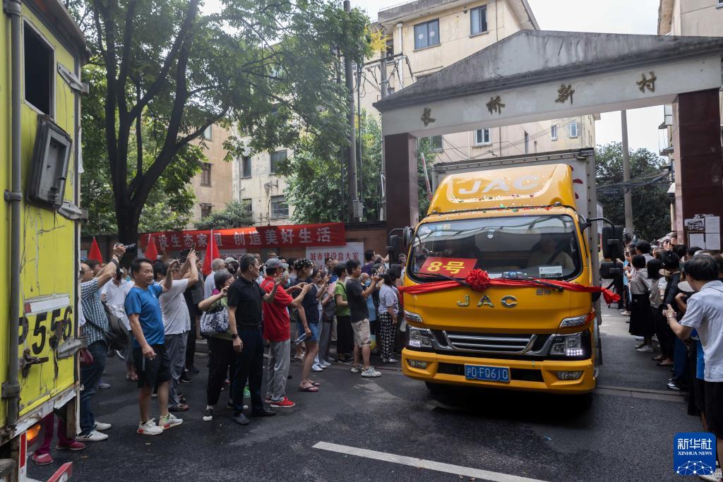 8月26日,居民簇拥在路边为长桥新村片区旧城区改建项目搬场居民送行。