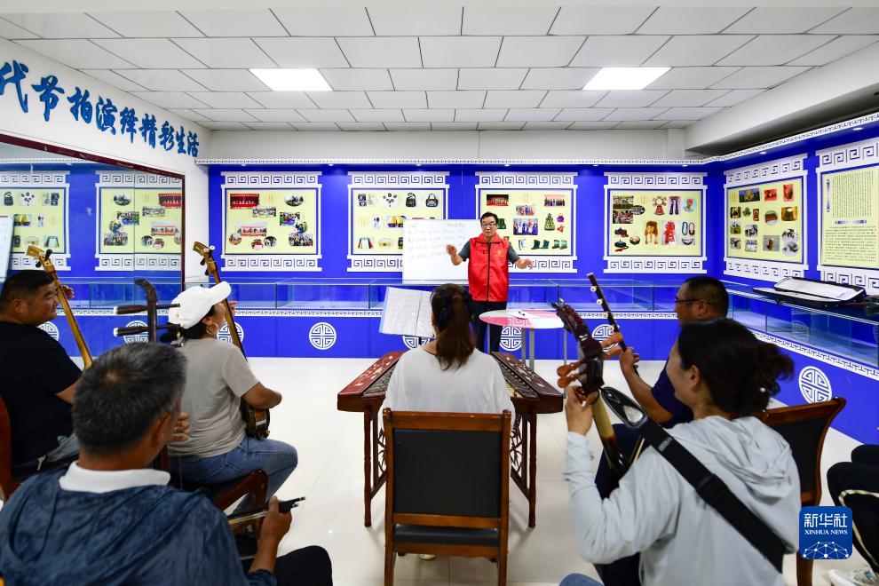 8月26日,在鄂托克前旗上海庙镇阿勒台嘎查文化活动中心美育课堂上,志愿者额尔肯吉日嘎拉指导农牧民练习演奏乐曲。
